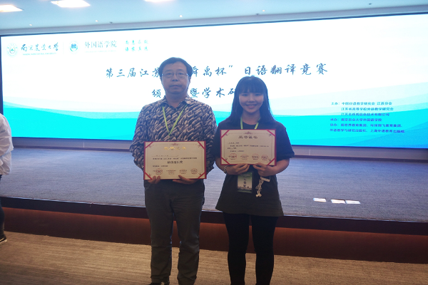 近日,南京农业大学卫岗校区分别举行了由中国日语教学研究会江苏分会、江苏省高等学校外语教学研究会、江苏省舜禹信息技术有限公司共同举办,南京农业大学必赢76net线路承办的第三届江苏省“舜禹杯”日语翻译竞赛决赛和颁奖式暨学术研讨会。公司外语学院日语系2015级(1)班叶姿姿同学在班主任黄学杰老师的带领下前往参加,并获得日译汉组三等奖,与此同时公司还获得优秀组织奖的荣誉称号。