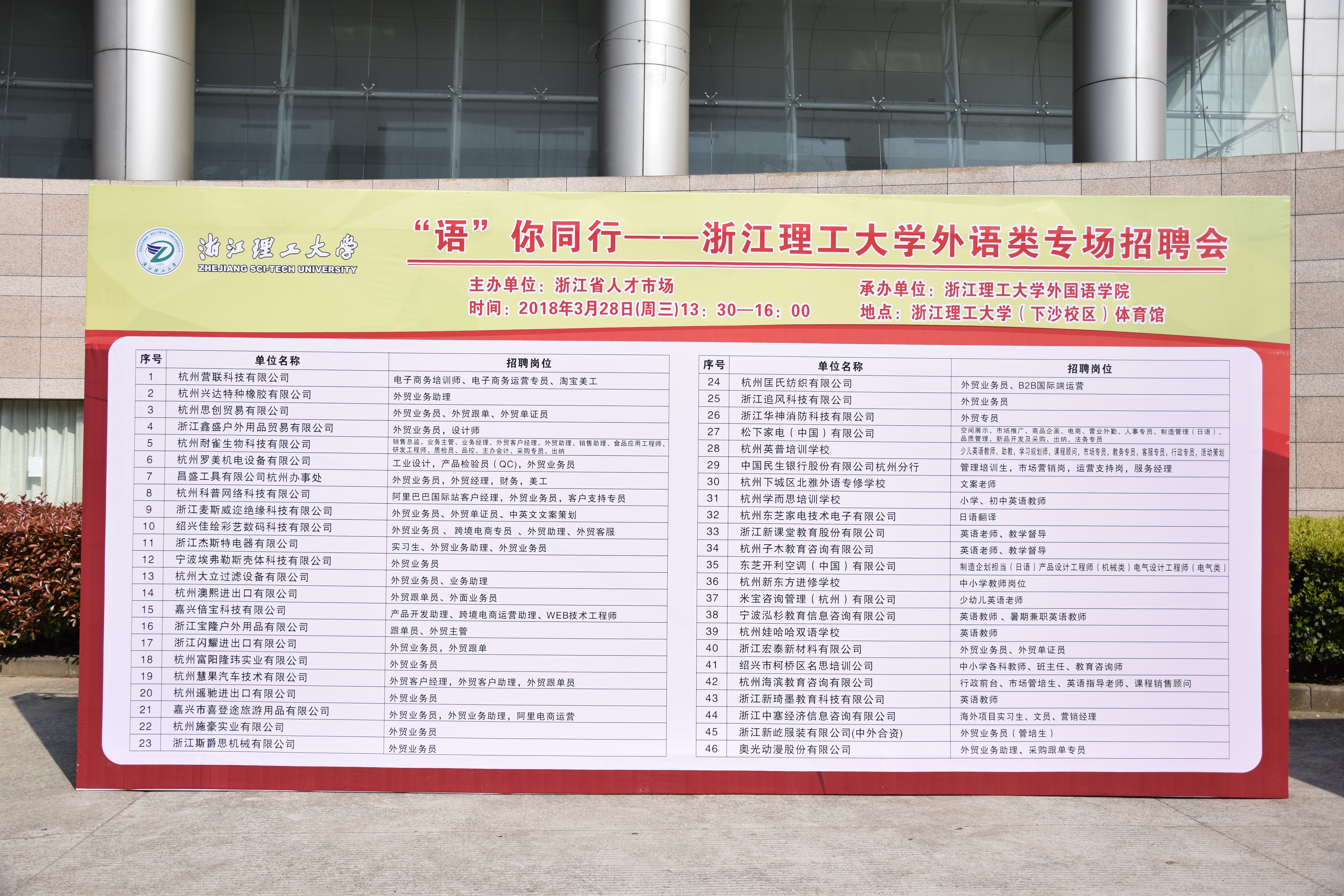 本次招聘会突出外语特色,主要岗位需求以英语、日语、法语专业为主,涵盖外贸类、外语教育培训类、法务类、机械类等行业。参会企业包括杭州新东方进修学校、杭州学而思培训学校、东芝开利空调(中国)有限公司、浙江新屹服装有限公司(中外合资)等企业,提供了150余个岗位,吸引了包括公司、浙江工商大学、中国计量大学、同济大学浙江学院等院校200余名员工参与。