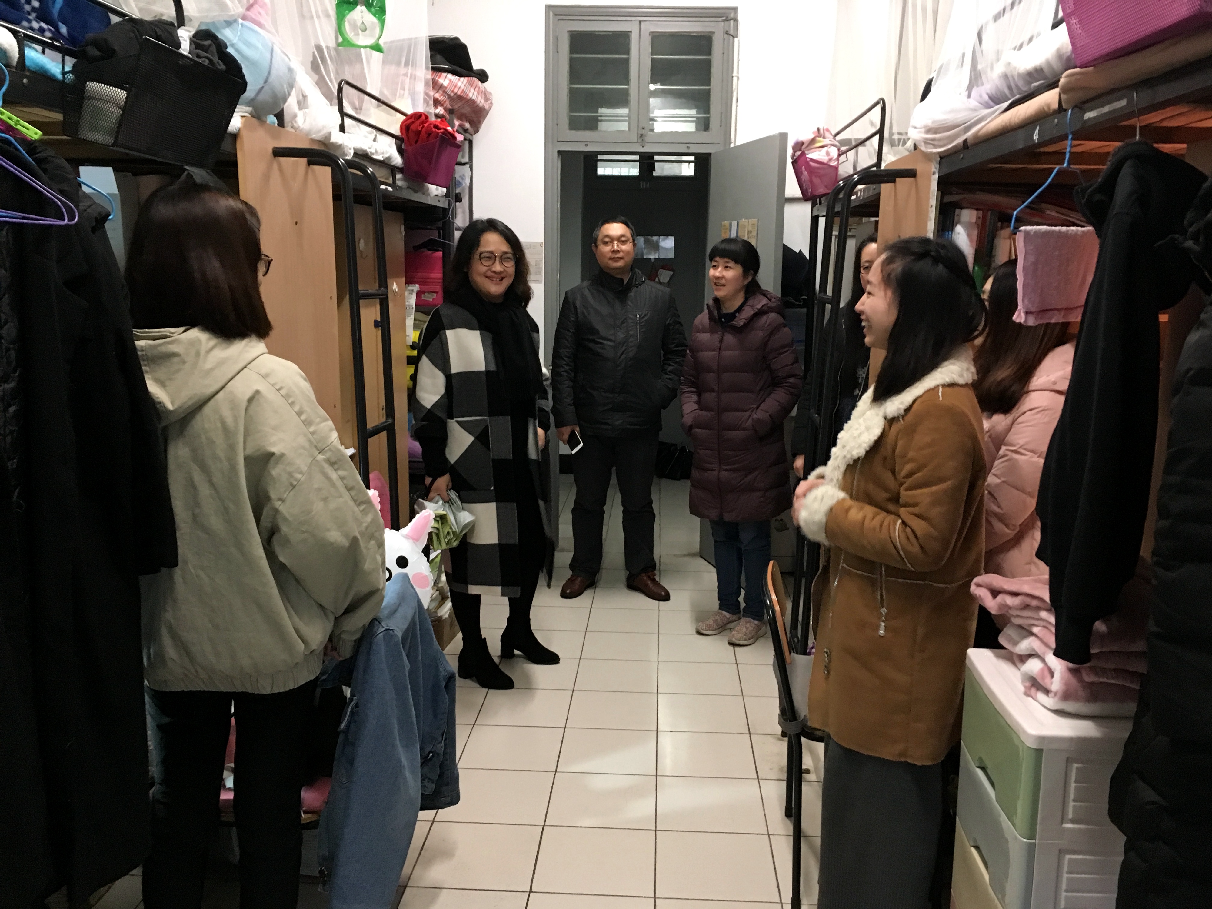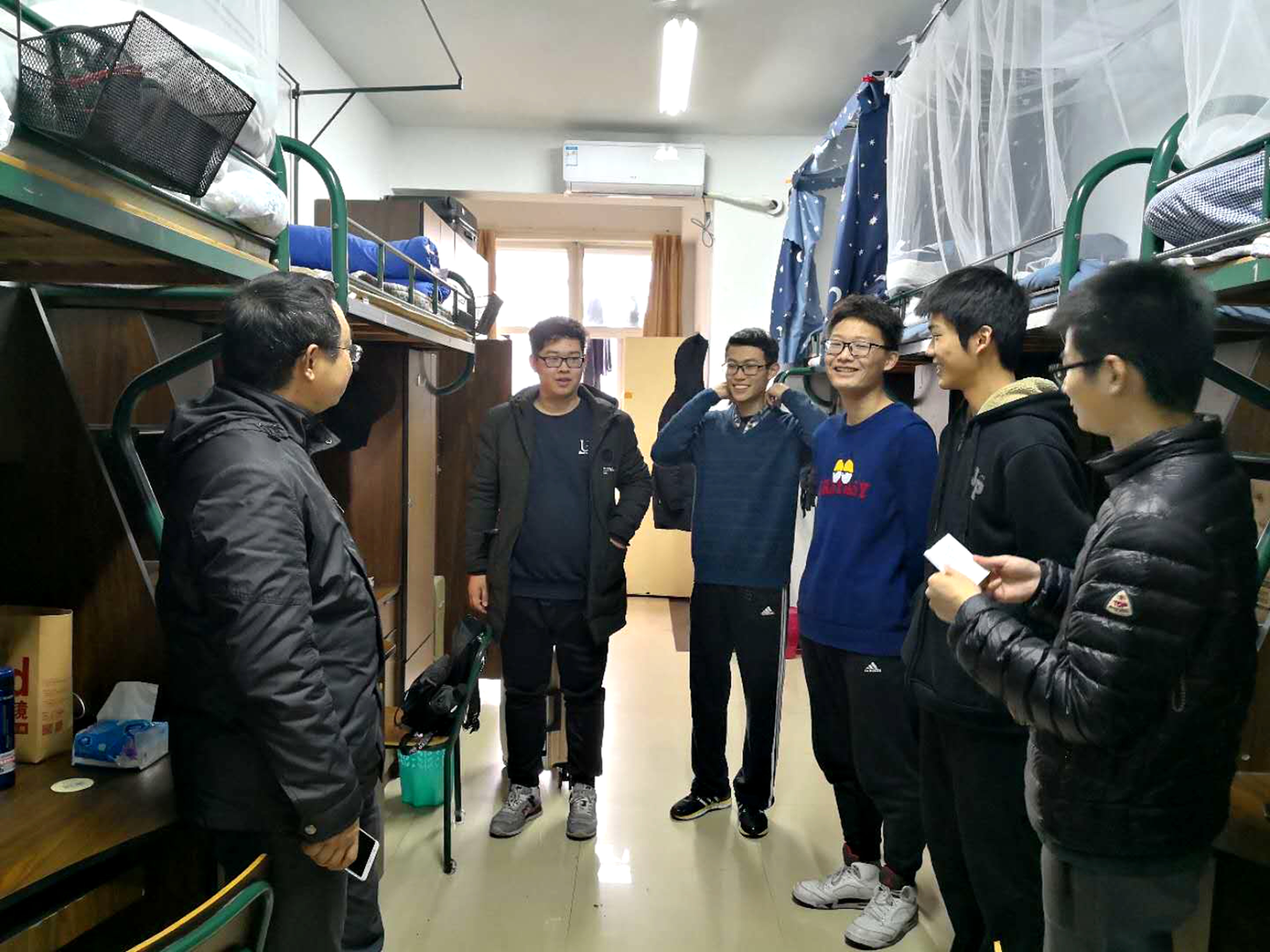 12月29日中午,公司党委书记王晓军、副经理文炳、党委副书记夏青一行在辅导员徐斌的陪同下,走访了学院部分大三女生寝室和大一男生寝室。