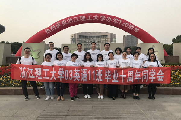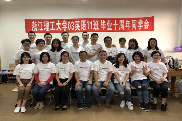 经前期精心筹划,各班级在学院志愿者的协助下顺利开展了毕业十周年同学会。十年再聚,每个班级都异常重视,各班定制了横幅和纪念班服,准备了同学会纪念品,并邀请了当年班主任及任课教师到场。同学会上,所有人围坐一圈,轮流发言讲述自己这十年来的经历、表达重返母校的感慨。03级英语11班邀请了班主任林联村和任课教师伍锋教授参与同学会,伍锋教授特意给时隔10年回校的学子们上了题为"Transition, adaptation and life-long learning"的人生一课。毕业十年,意气风发的学子们重回课堂,在相同的教室再次聆听老师的教诲,这是一次回归,也是再一次从浙理出发。