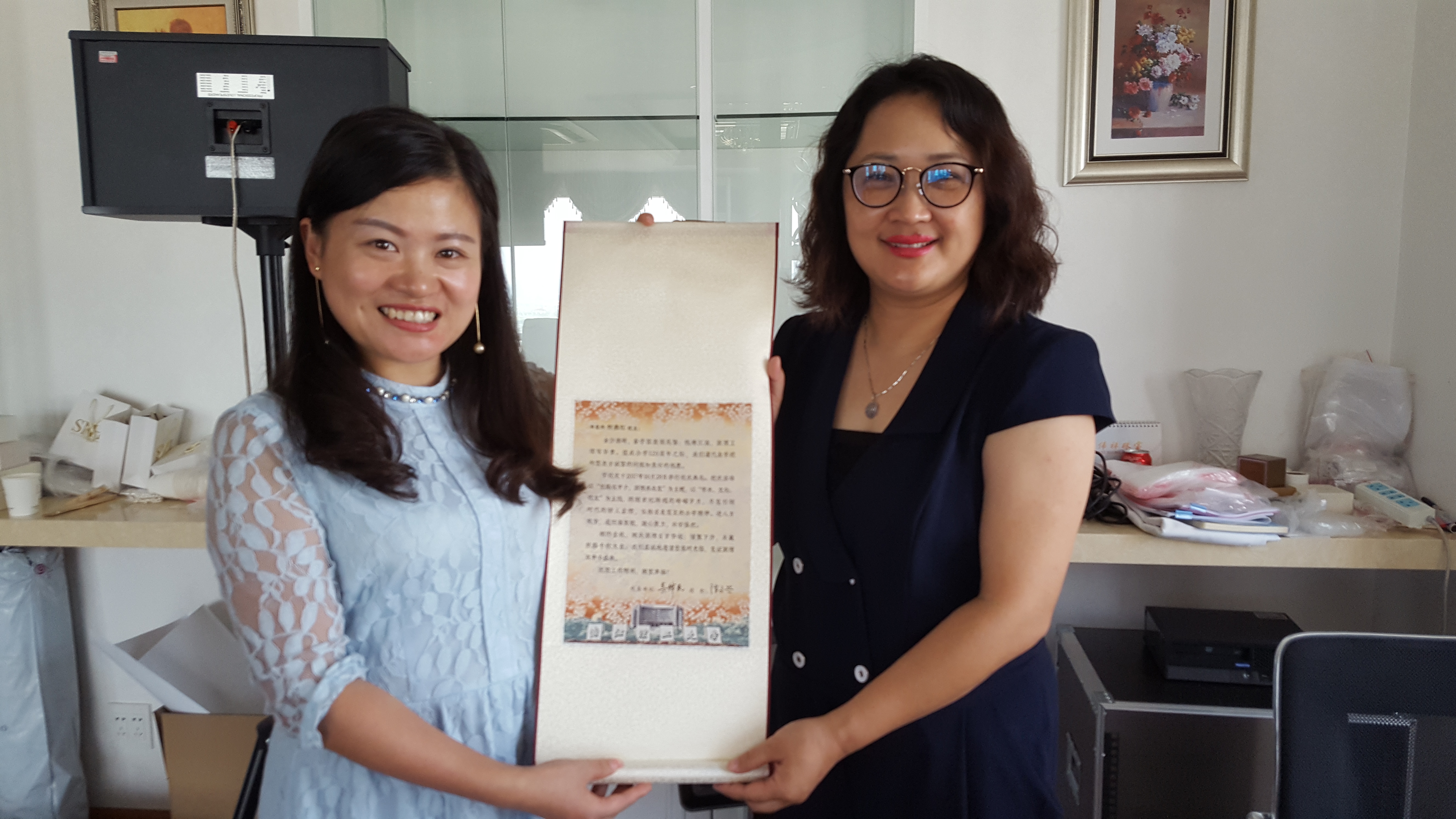 王晓军向何燕红介绍了学院发展,通报了校庆的筹备情况,代表学院真挚邀请何燕红回母校看看,并赠送了学校120周年校庆织锦邀请函。何燕红回忆起在学校学习、工作、生活的美好时光,讲述了自己近几年的工作、生活情况,表示自己的成长离不开学校、学院的培养。王晓军一行还参观了公司珠宝展示厅、网络销售直播间等场地。