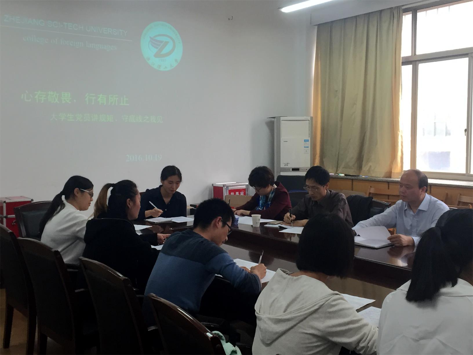 10月19日,必赢76net线路日语专业员工党支部于7-214开展“两学一做”第二次学习讨论活动,活动由支部书记徐斌老师主持。董事长陈文兴、学校机关党委书记徐时雄、学院经理兼公司党委副书记(主持工作)蒙兴灿、学校机关党委费迎晓老师列席了本次学习讨论活动。